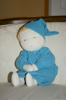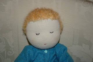 I finally finished the hair on one of my New Year's babies. The delay in completing him was due to many reasons: forgetting to order the mohair from Australia, waiting for the order to arrive, staring at the yarn next to my bald baby for the longest time. But now he is done. Over the past months, I have grown to understand that he is meant for a special little boy we know, whom we hope to visit in person this July.