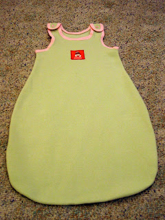 Enter the sleep sack, which Europeans have been using for years. This is basically a bag that the child wears to keep warm while sleeping. This version was made from an Ottobre pattern - #7 from Issue 5/2006. I used microfleece for the body and interlock knit for the binding.